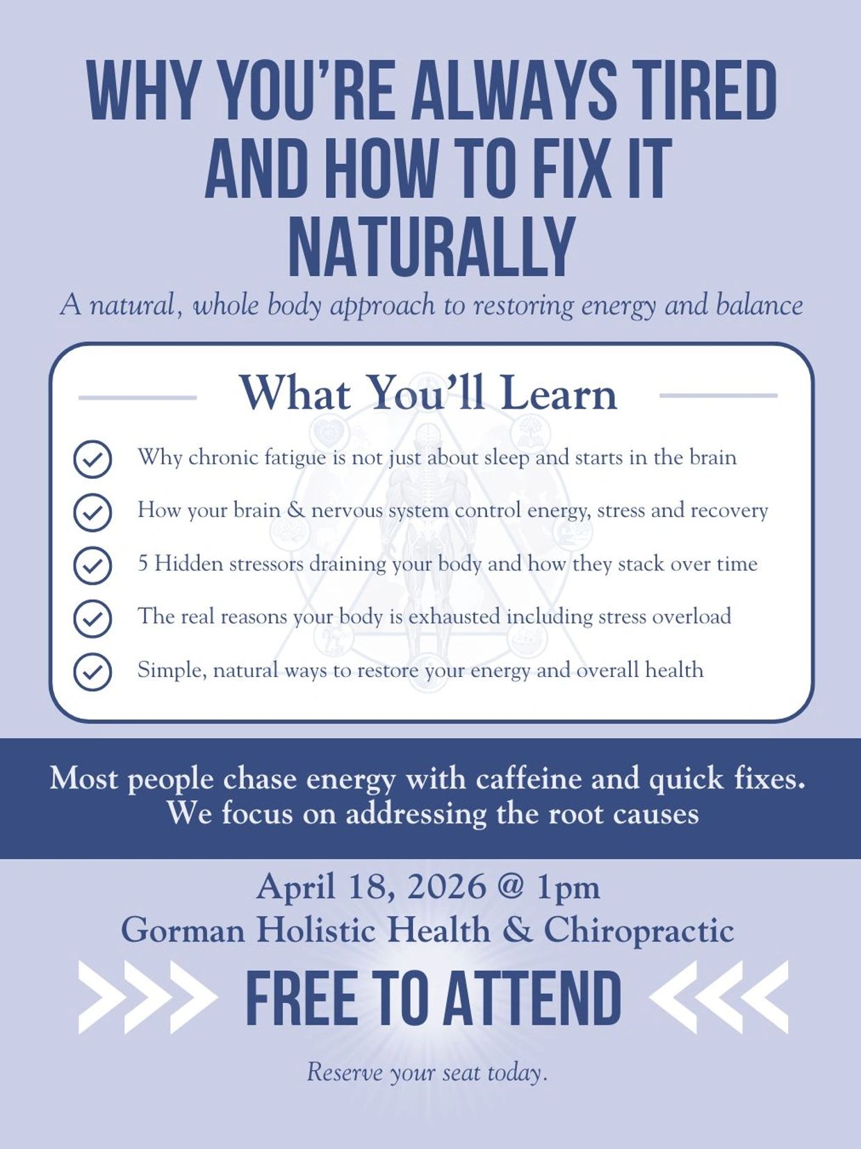 In this free community talk, we will break down the real reasons behind chronic fatigue and what your body is trying to tell you. You will learn how your nervous system controls energy, how stress accumulates in the body and what needs to be addressed to restore energy naturally.
